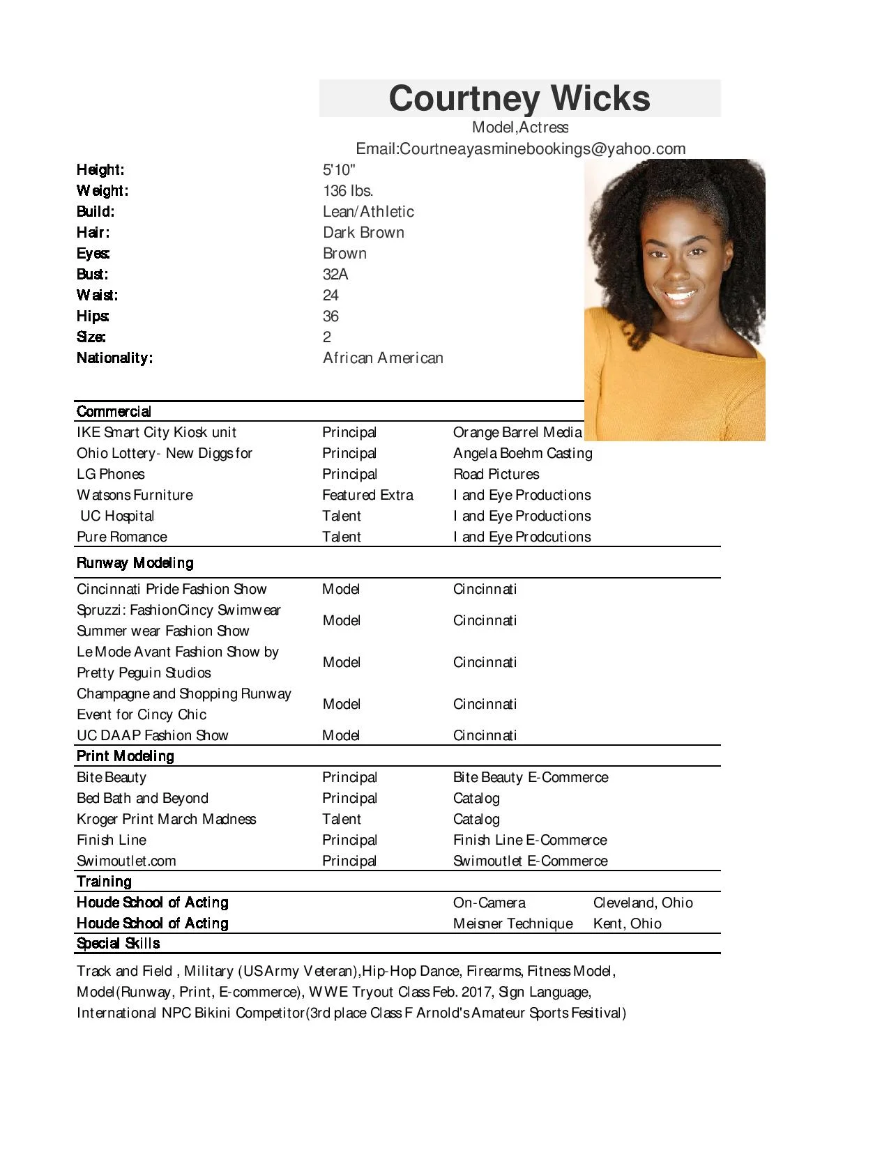 Special Skills: Track & Field, Military (US Army Veteran), Hip Hop Dance, Firearms, Fitness Model, Model (Runway, Print, E-Commerce),Sign Language, International NPC Bikini Competitor (3rd Place Class F Arnold’s Amateur Sports Festival)